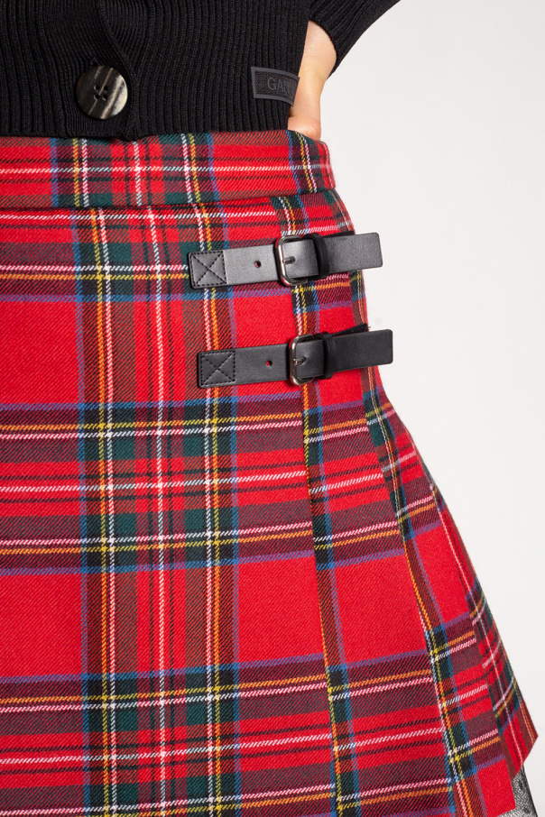 Red and black pleated skirt from Red Valentino. Made of wool, this design features a zip and hook fastening at the back, multicolored check pattern, decorative buckle straps and black tulle lining.