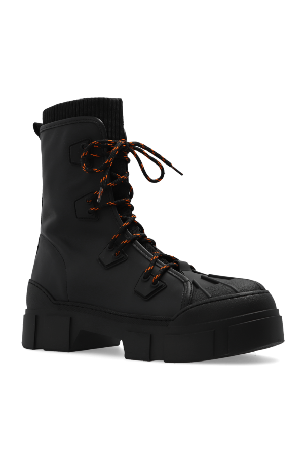 Black boots from Vic Matie. Made of leather, this lace-up pair features a fabric sock with a ribbed cuff, toe covered with rubber, branded pull tab at the back and black rubber sole.
