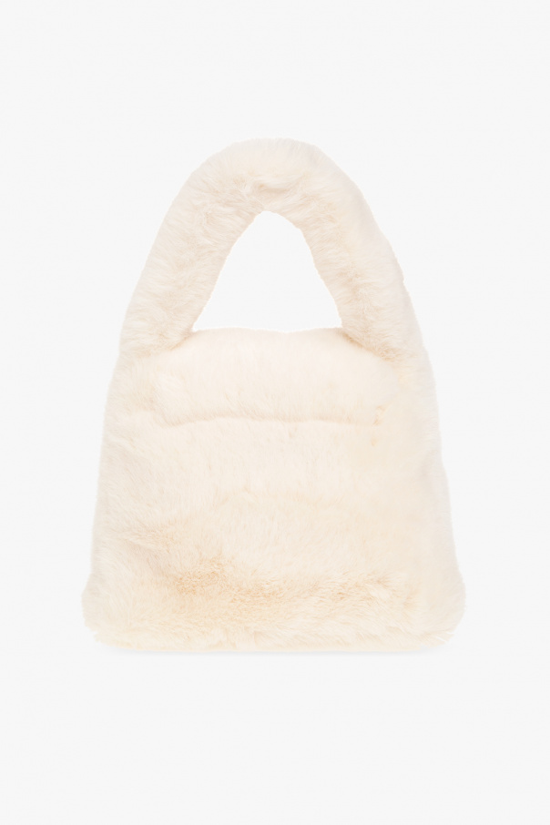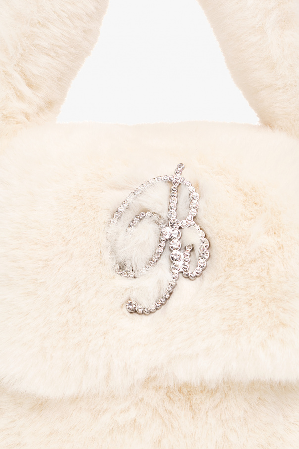 White handbag from Blumarine. Made of faux fur, this design features a snap-fastened flap, metal logo appliqué, crystals, short handle, one internal compartment and silver-tone metal hardware.