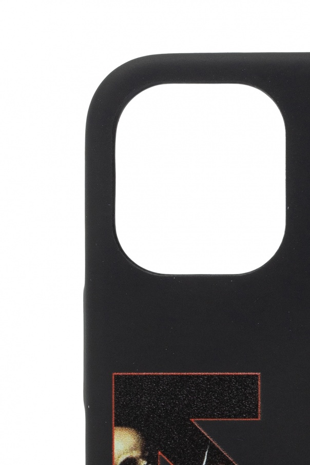 Black iPhone 12 Mini case from Off-White. This item is decorated with a colorful print and a white logo.