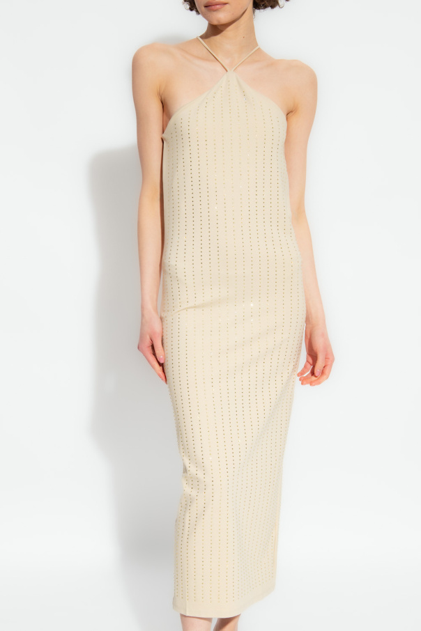 Beige ‘Crystal’ dress from Samsoe Samsoe. This design features halterneck straps, crystals and slit at the back.