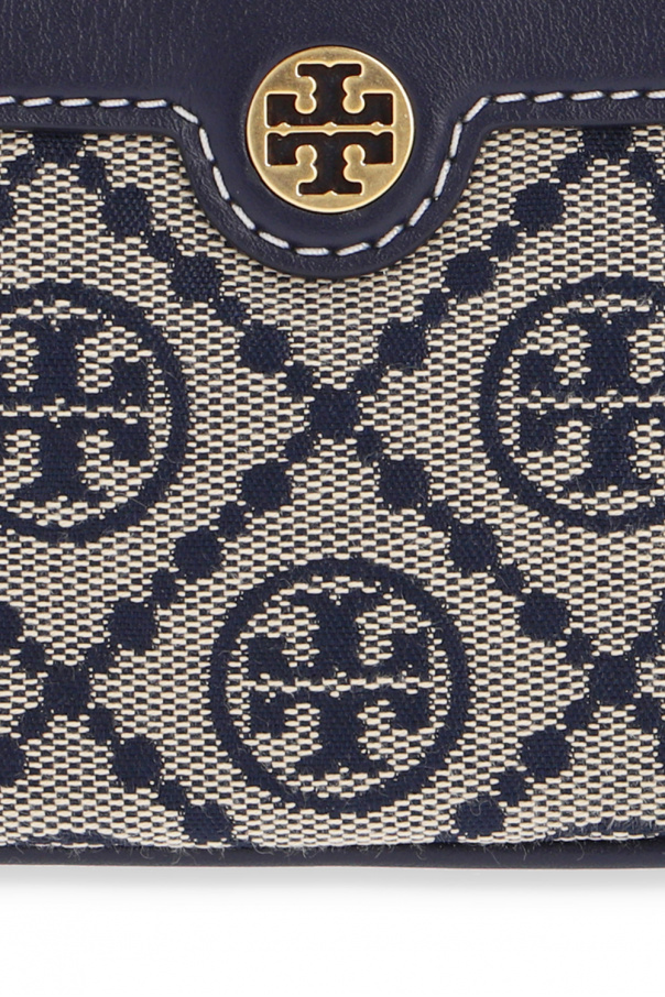 Navy blue and beige key holder from Tory Burch. Crafted in leather and woven jacquard with a classic ‘T Monogram’ pattern inspired by traditional Pennsylvania Dutch quilting, this design features iconic ‘Double T’ hardware on the front, gold-tone metal elements and a yellow-clad interior with a lobster clasp on a chain. Item can be used as card case, too.