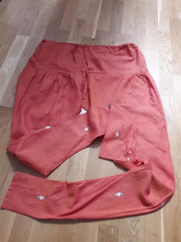 Штаны очень широкие в талии и бедрах, узкие к манжетному низу, плиссируются завязкой вокруг талии.