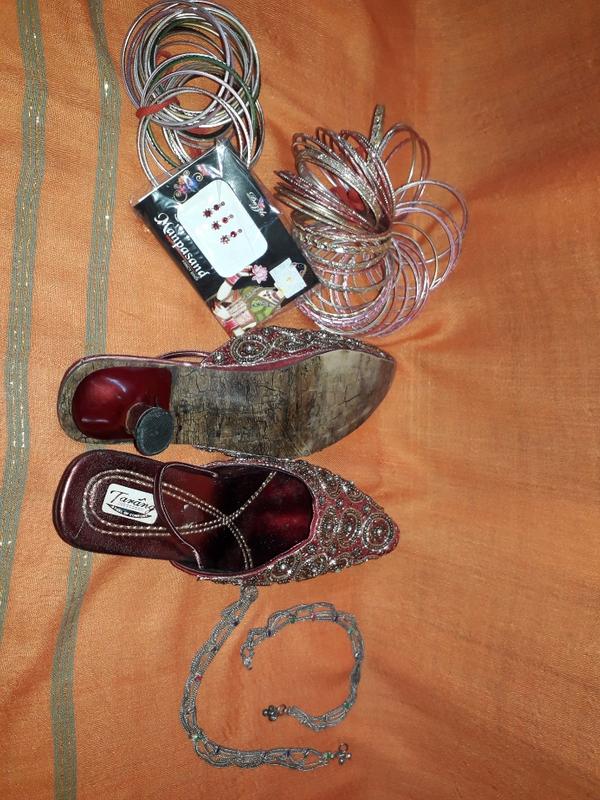 В подарок к костюму традиционные расшитые бисером туфли (размер 36-37), браслеты и анклеты (браслеты-цепочки на ноги), наклейки на переносицу
