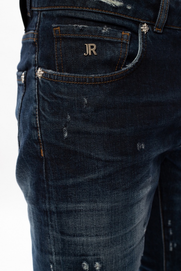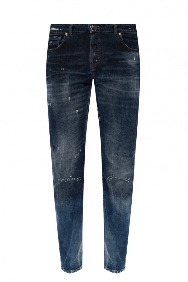 Dark blue ‘Sid’ distressed jeans from John Richmond. Fastened with buttons, this tapered leg design is complete with two front pockets and two back pockets.