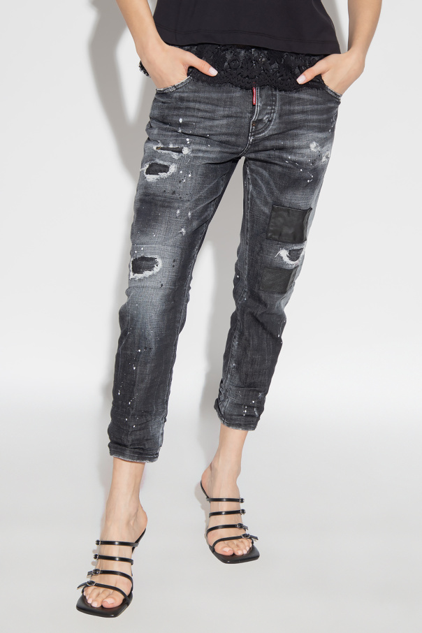 Dark grey ‘Cool Girl’ jeans from Dsquared2. Made of cotton, this tapered leg pair features button fastenings, distressed details, washed effect, black faux leather patches, white logo patch at the back and five slip pockets.