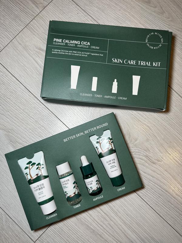 ROUND LAB Pine Calming Cica Trial Kit - сет миниатюр продуктов из линейки Pine Calming Cica с запатентованным комплексом Pine Cica Activer TM с экстрактом игл сосны и центеллы.