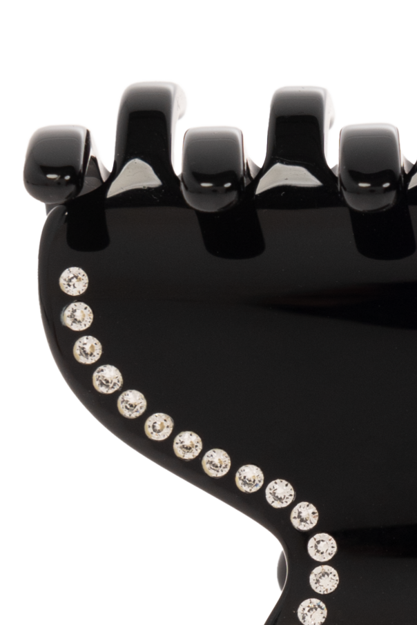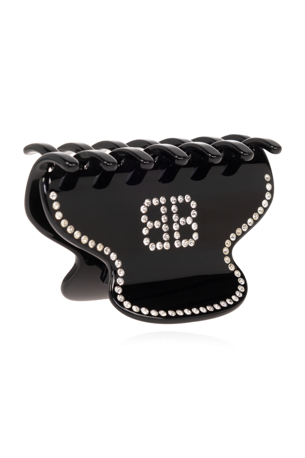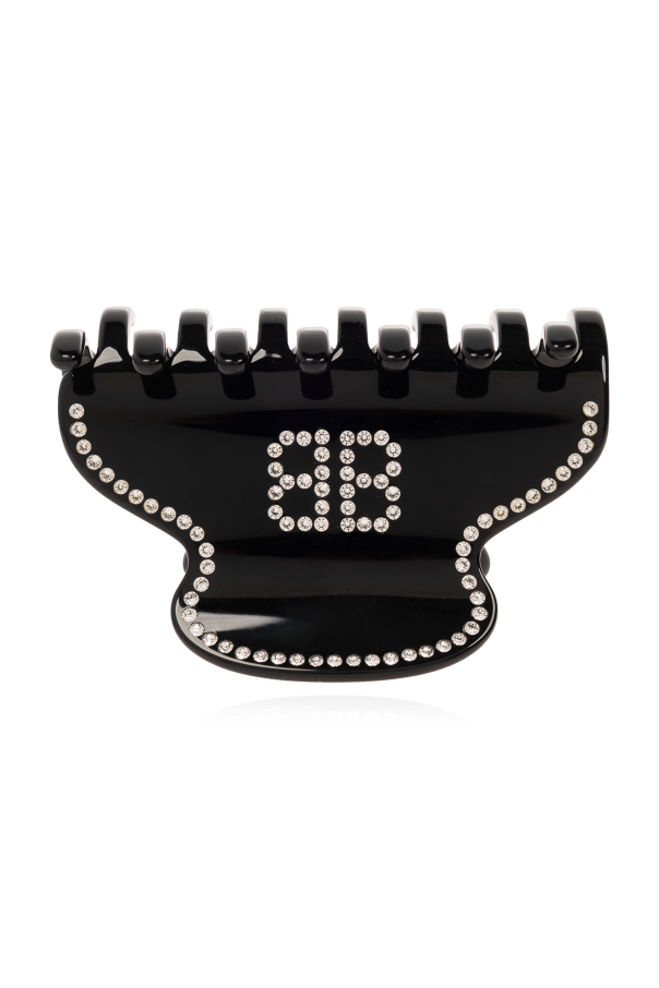 Black hair clip embellished with logo-shaped crystals from Balenciaga.