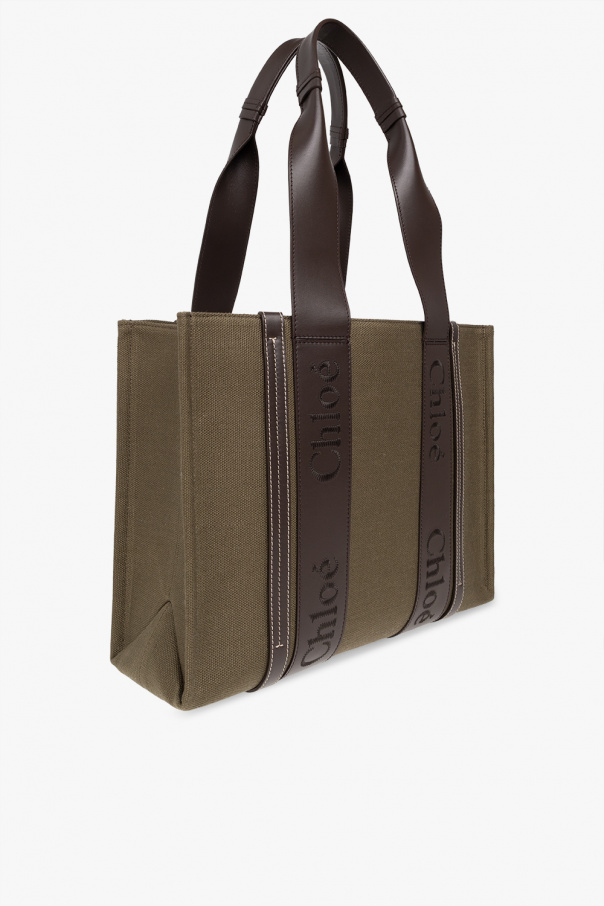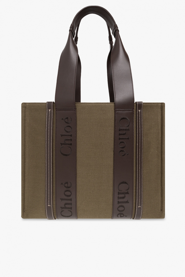 Dark green ‘Woody Medium’ shopper bag from Chloé. Crafted from linen canvas with dark brown calf leather trims, logo embroidery, two half-round handles and one internal compartment with one slip pocket.