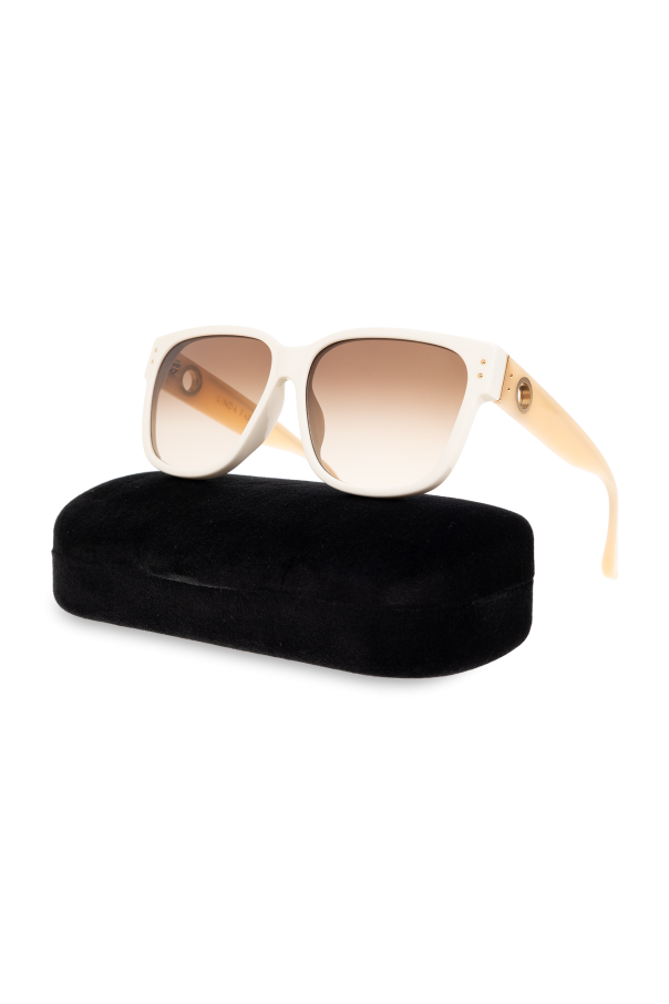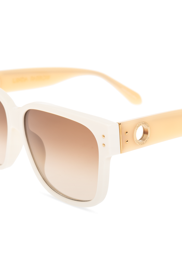 Introducing the \'Perry\' Sunglasses by Linda Farrow, a quintessence of elegance merged with a touch of vintage charm. These sunglasses feature large, rectangular frames with slightly rounded corners, crafted in creamy or light beige hues that evoke an air of sophistication. The frames, made from high-quality acetate, ensure durability while offering a lightweight comfort. The brown-tinted lenses not only exude style but also provide essential protection against the sun\'s glare, making these sunglasses a perfect companion for any outdoor endeavor. Gold accents on the temples add a layer of luxury, highlighting the designer\'s attention to detail and commitment to excellence. Designed to complement various face shapes, the \'Perry\' sunglasses affirm their versatility and universal appeal. Accompanied by a plush, black velvet case and a striped scarf or handkerchief, this set offers more than just eyewear—it presents a comprehensive accessory solution. Why Purchase the \'Perry\' Sunglasses? Elegant design with a vintage twist, suitable for any occasion. Crafted from high-quality acetate for durability and comfort. Brown-tinted lenses providing essential sun protection. Gold accents on the temples for an added touch of luxury. Comes with a high-quality case and a chic scarf, enhancing the overall value.