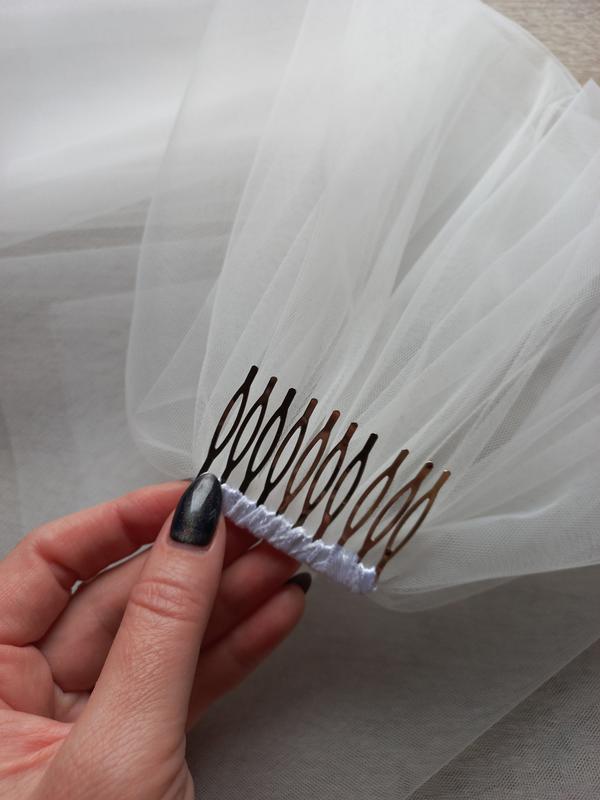 Классическая короткая не пышная фата подойдёт к свадебному платью любого фасона