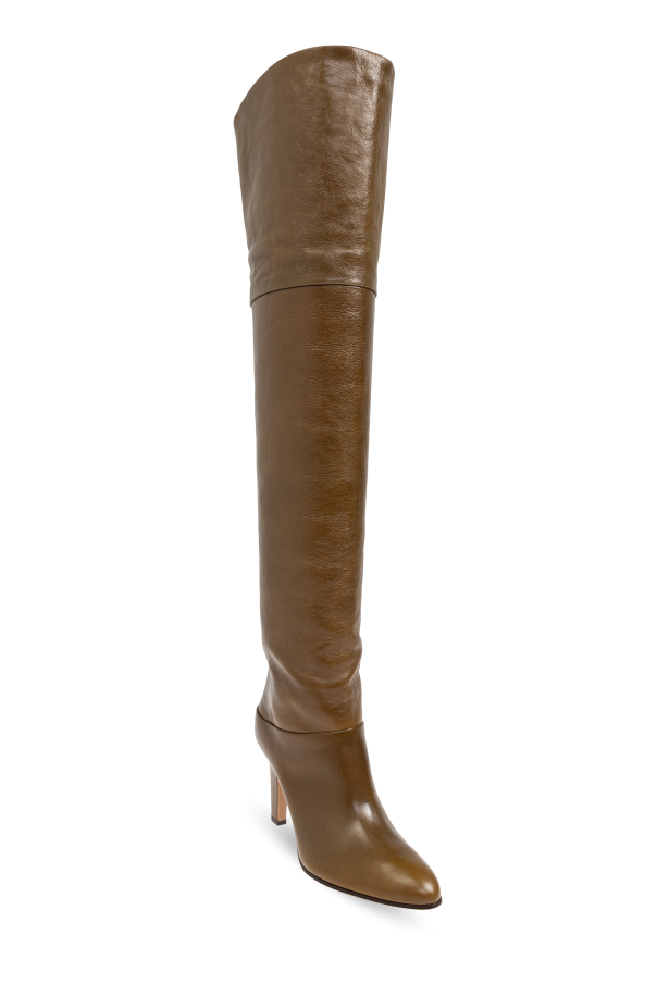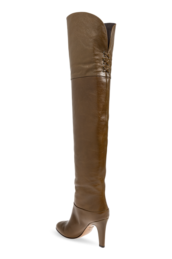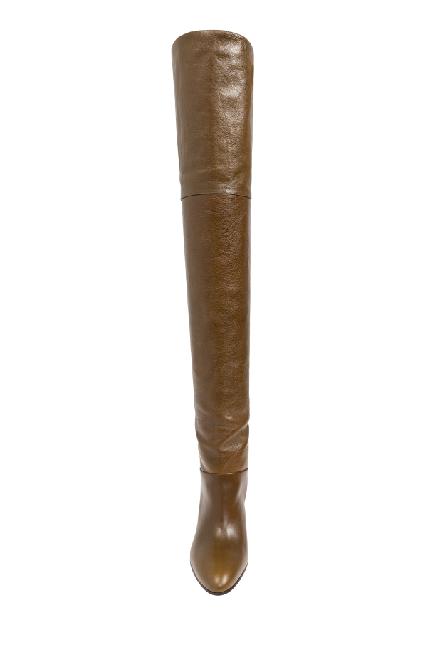 Introducing the Eve high-heeled boots from our exclusive collection, a paragon of elegance and sophistication. These boots, crafted by the renowned Parisian fashion house Chloé, embody a timeless aesthetic that seamlessly combines modernity with classic design. The Eve boots extend gracefully above the knee, reaching up to the thigh, creating a sleek and elongated silhouette. The refined high heel accentuates their elegance, while the smooth, khaki-colored leather provides a luxurious finish. The boots feature a subtle horizontal seam at the knee, adding a tasteful touch of detail. For ease of wear, a discreet zipper is placed at the back of the upper shaft. The rounded toes enhance the boots\' sophisticated appearance, ensuring they are a versatile addition to both casual and formal ensembles. The Eve boots are free from visible logos, emphasizing their understated elegance. Why Choose This Product? Exquisite design by Chloé, a leader in luxury fashion Crafted from high-quality natural leather Elegant high-heel and thigh-high design Discreet zipper for easy wear Versatile khaki color, suitable for various outfits