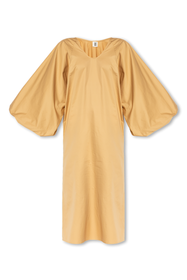 Beige ‘Parida’ oversized dress from By Malene Birger. Made of organic cotton, this design features two slip pockets, a round neck, puff sleeves and side slits at the hem.