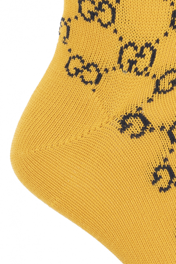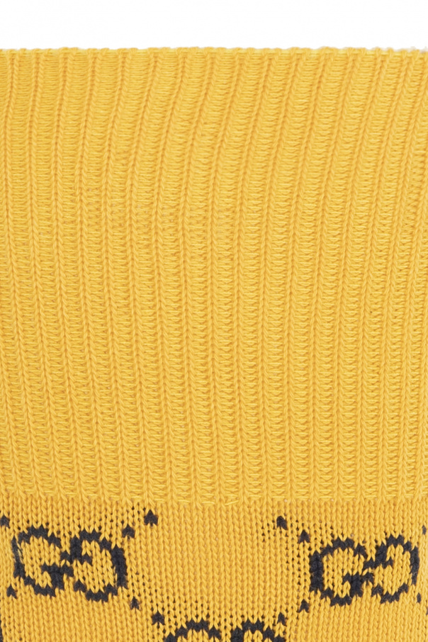 Yellow ribbed long socks from Gucci, 'GG Mulicolor' collection. Made of cotton, this design features an embroidered logo pattern in navy.