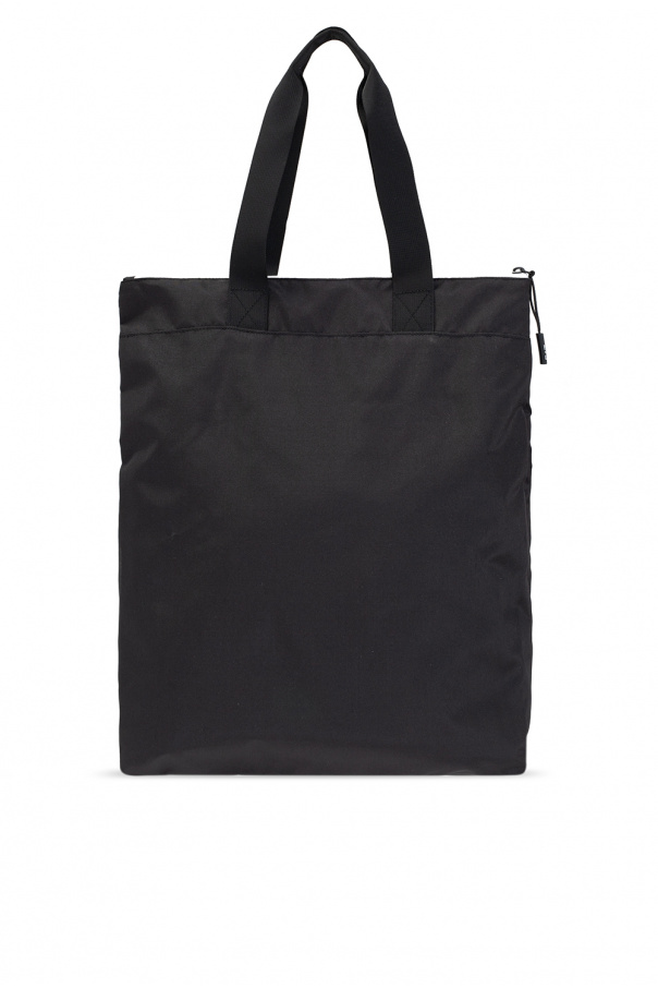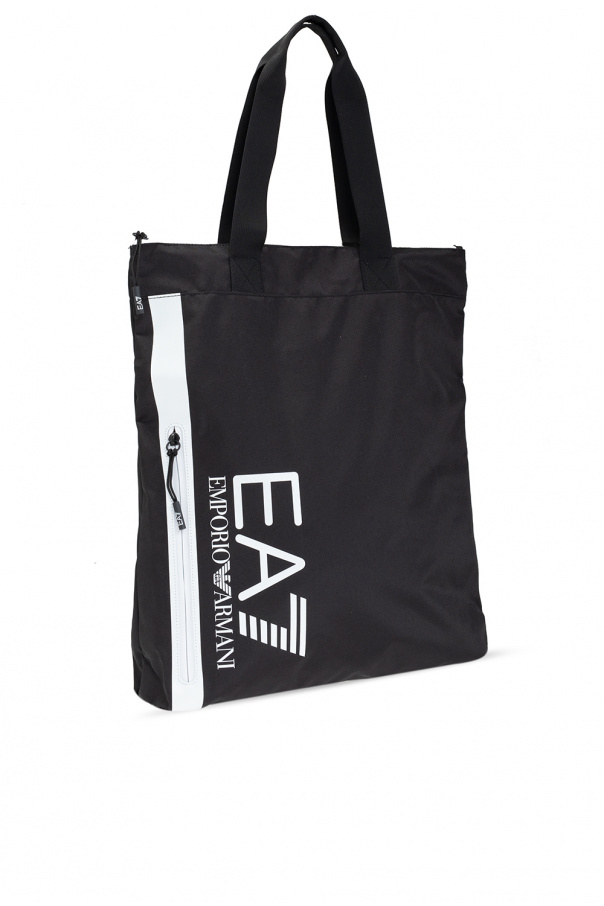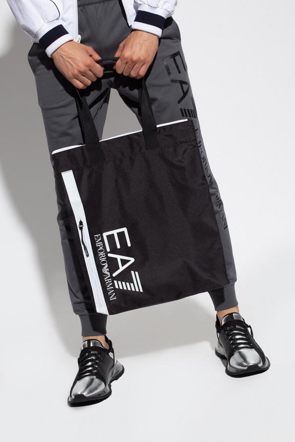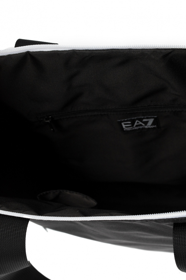 Black hand bag from EA7 Emporio Armani. Fastened with a zip, this design features a printed logo pattern in white, front zip pocket, two half-round handles, white and black metal hardware as well as one internal compartment with two slip pockets and one zip pocket.