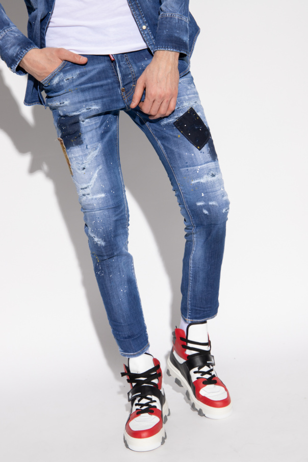 Blue and navy blue ‘Super Twinky’ jeans from Dsquared2. Made of cotton, this pair showcases a distressed treatment, paint splatters, camo patches, button fastenings, classic five pockets and tapered legs.