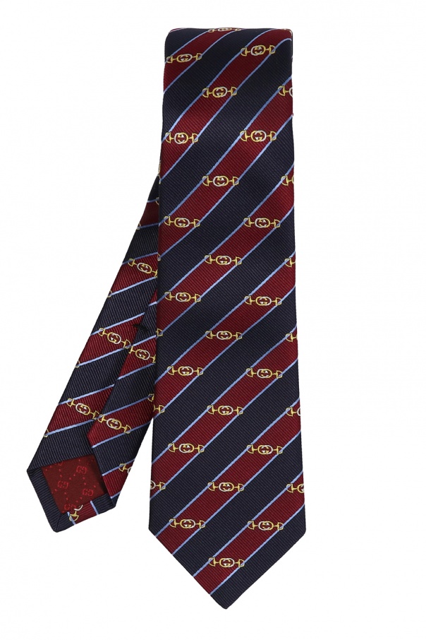 Maroon and navy tie from Gucci. This elegant accessory crafted from silk comes embellished with blue stripes and a horsebit motif in beige and yellow.