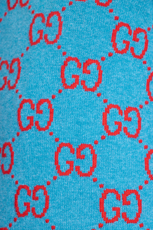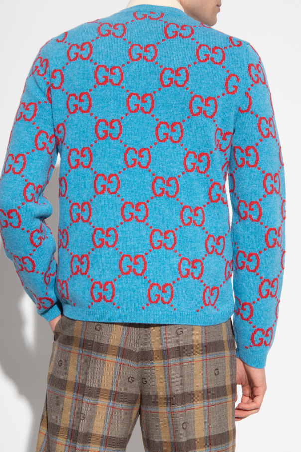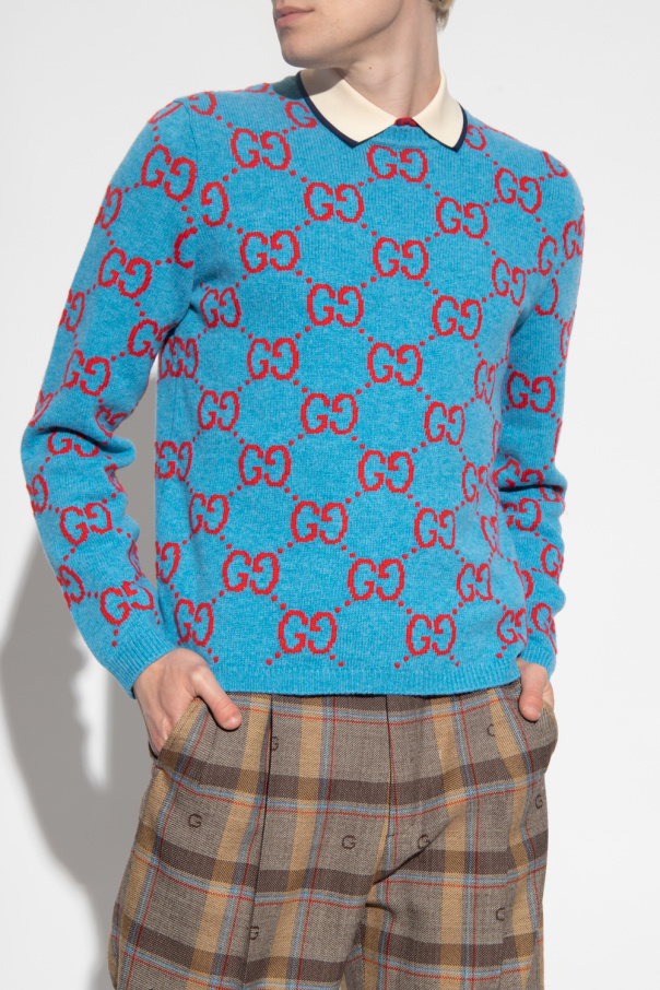 Blue sweater from Gucci. Crafted from wool, this garment features a red GG monogram embroidery and ribbed trims at the crew neck, hem and cuffs.