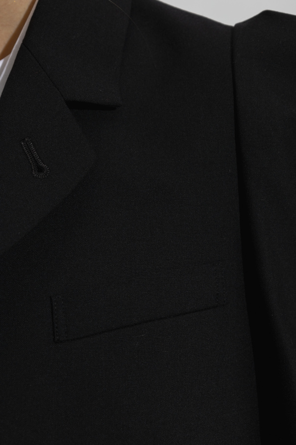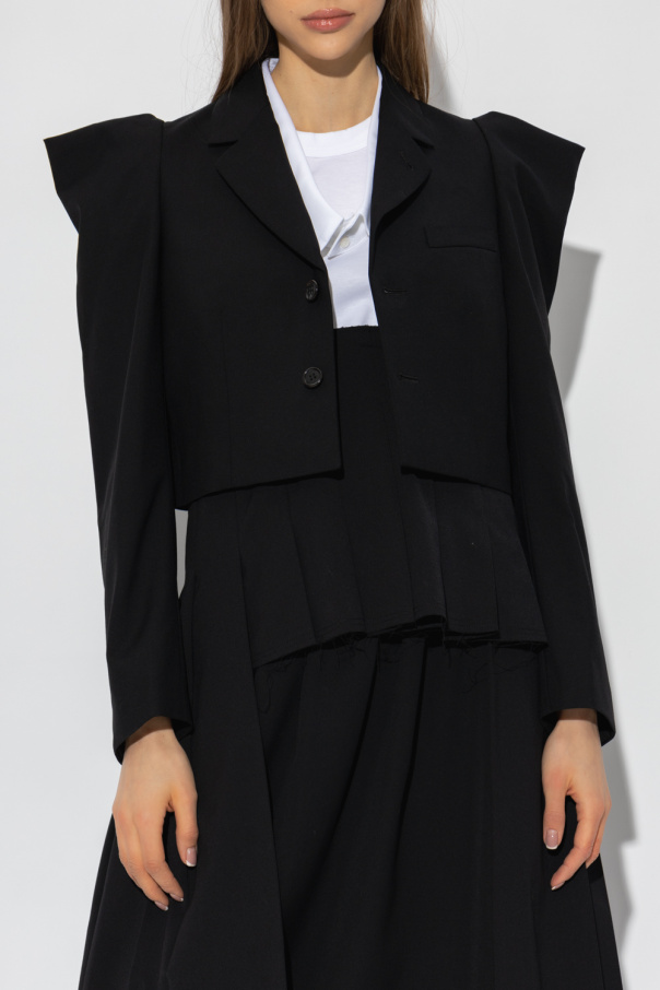 Black cropped blazer from Comme des Garcons Ninomiya. Made of wool, this long sleeve design features button fastenings, a slip pocket and decorative trimming at the shoulders.