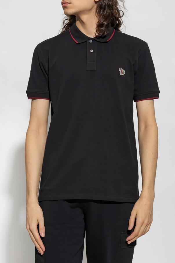 Black polo shirt from PS Paul Smith. Made of organic cotton, this garment features buttons at the neck, multicolored patch with the brand\'s signature zebra motif and short sleeves with ribbed cuffs.