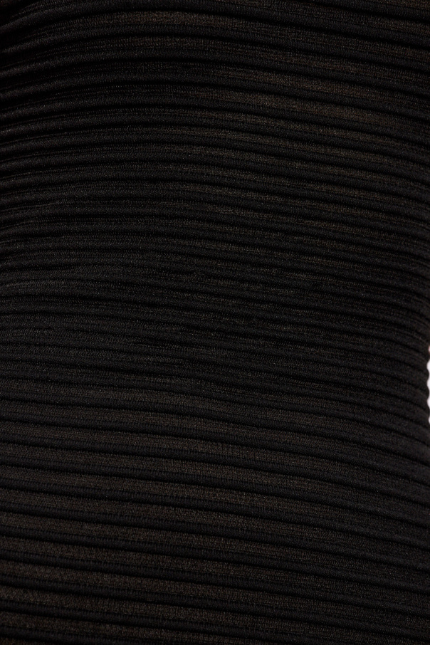 Black transparent dress with a stand collar from Alaia. Fastened with a button at the back, this short sleeve design features a stripe pattern, cut-out at the back and slip dress lining.
