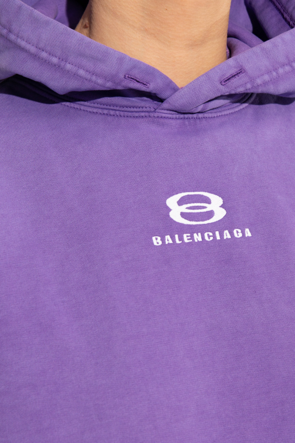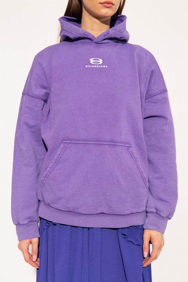 Purple hoodie from Balenciaga. Crafted from cotton jersey, this style showcases white logo embroidery and a kangaroo pocket on the front and ribbed trims on the bottom hem and cuffs.