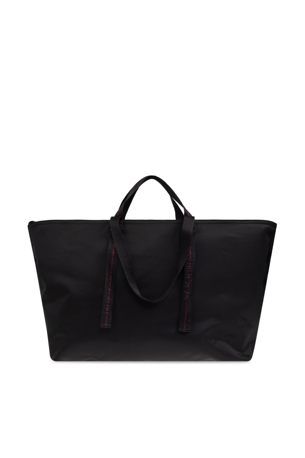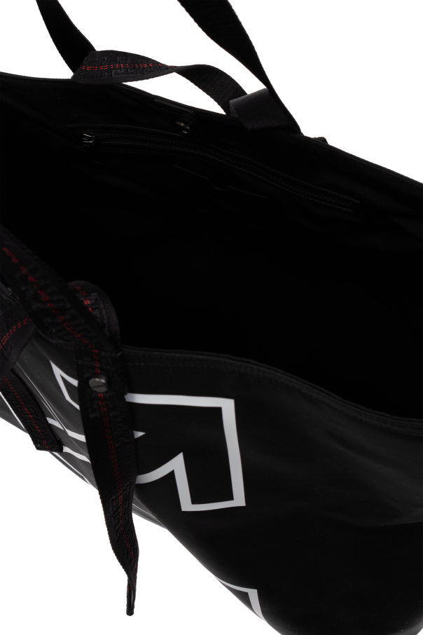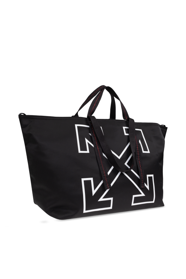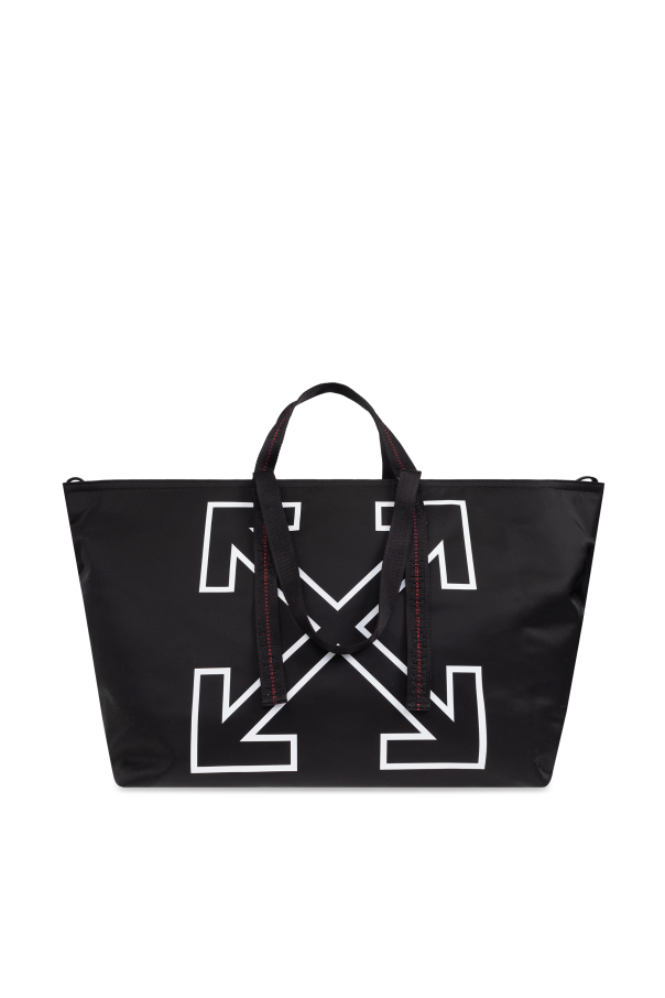 Introducing the Shopper Bag from the illustrious fashion house, Off-White. This sophisticated accessory embodies a timeless silhouette with a capacious interior, making it both practical and fashionable. Crafted from a sleek blend of leather and polyester, this black masterpiece features the iconic white arrow logo, a signature of the visionary designer Virgil Abloh. The bag\'s reinforced handles, adorned with striking black and red stitching, offer not only durability but also a touch of bold elegance. The interior reveals an expansive compartment with a zippered pocket, secured by a snap closure, ensuring your essentials are both safe and stylish. Meticulous stitching and robust finishes attest to the exemplary quality synonymous with the Off-White brand. Why Choose This Product? Iconic design with a bold logo statement. Spacious and practical for everyday use. Durable materials with a smooth, likely water-resistant texture. Exquisite craftsmanship with reinforced details.