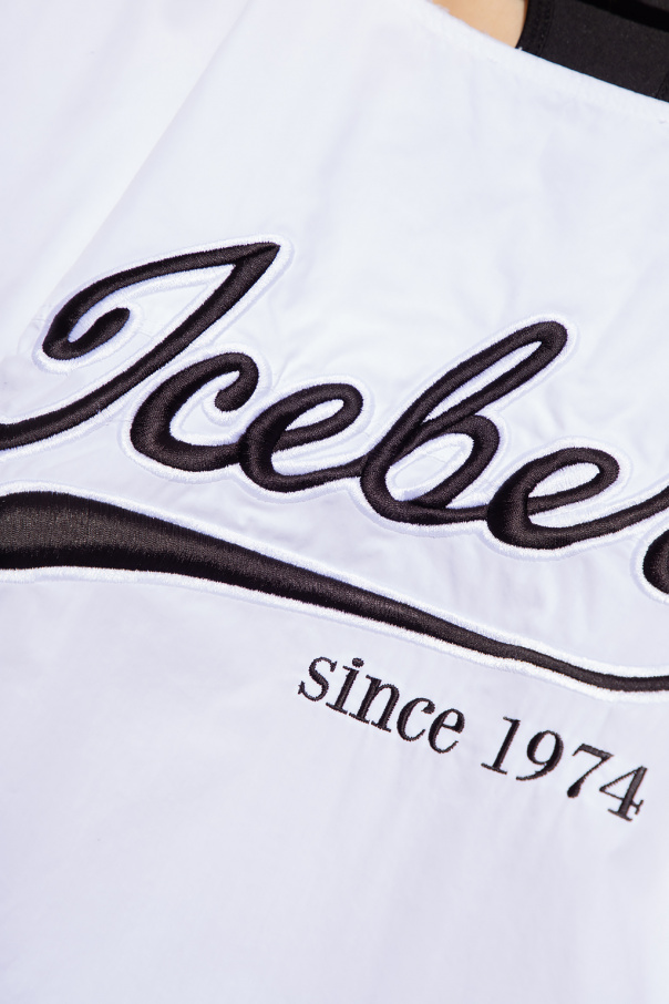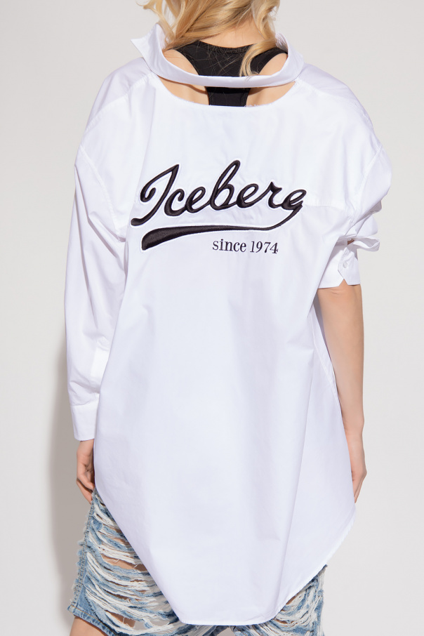 White shirt from Iceberg. Made from cotton with an oversize silhouette, this style features button fastenings, a slip chest pocket, long sleeves with button cuffs and a decorative raw-cut opening accompanied by black and white logo embroidery at the back.