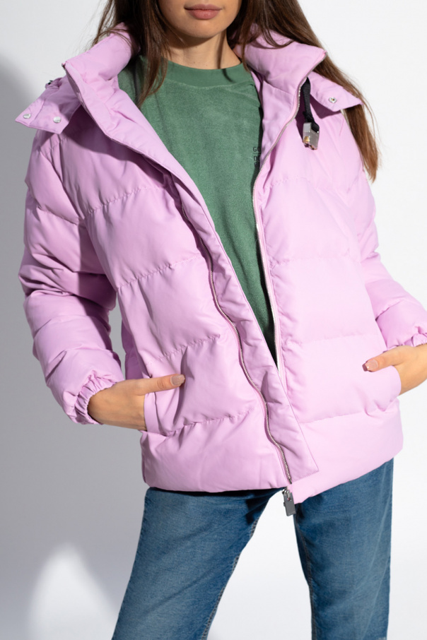 Pink insulated jacket from 1017 ALYX 9SM. Fastened with a zip, this garment is complete with a detachable drawstring hood, black strap with the label’s signature, silver-tone and gold-tone rollercoaster buckle, two snap-fastened pockets and elasticated cuffs.