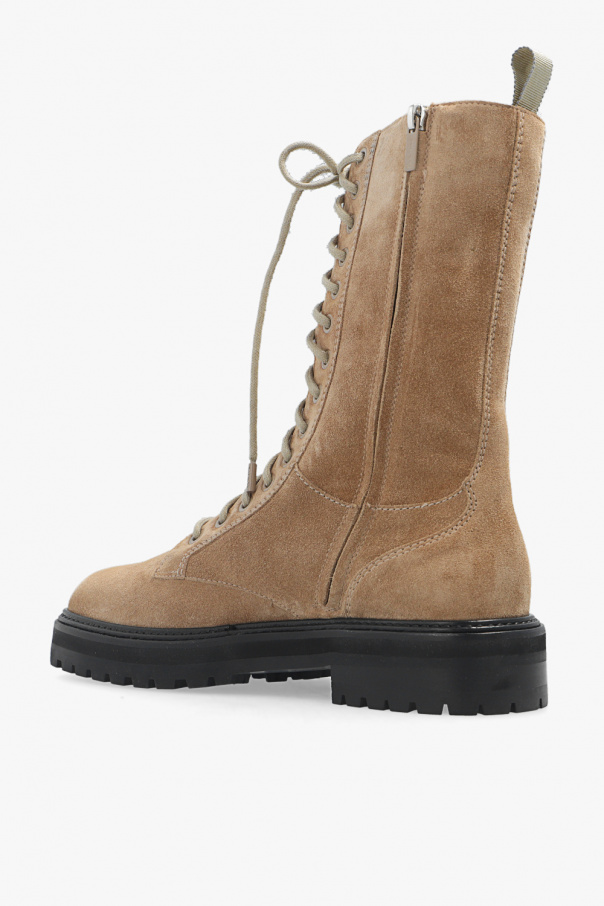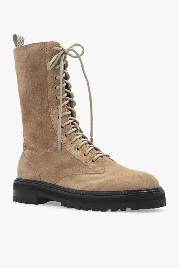 Greyish beige ‘Cara’ ankle boots from Jimmy Choo. Made of suede, this pair is complete with a side zip and black rubber sole.