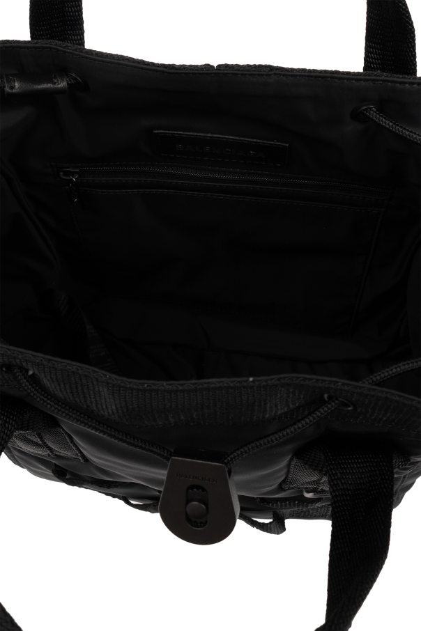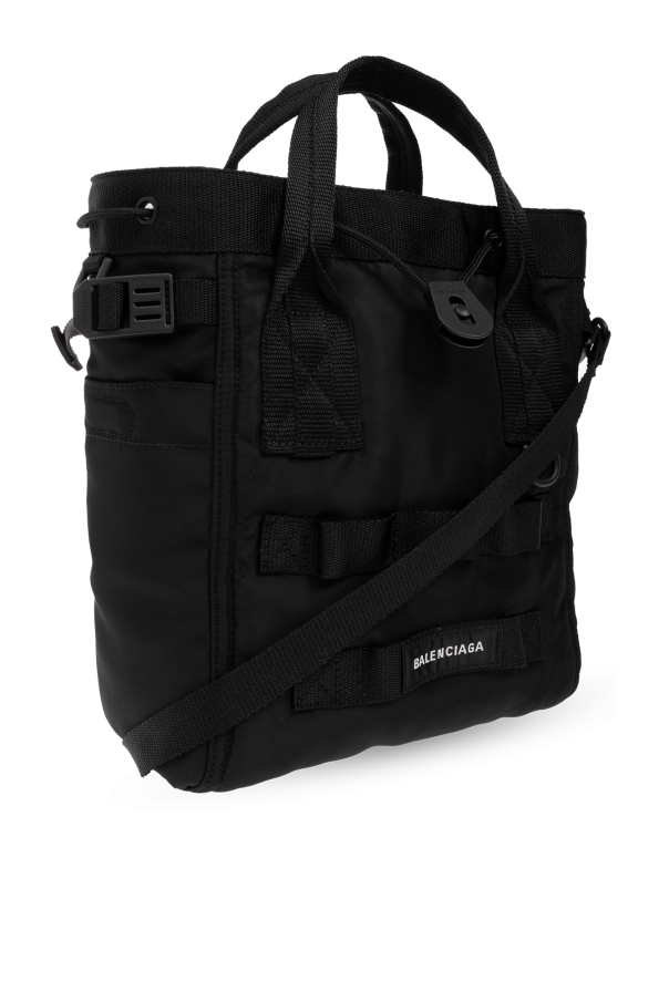 Black ‘Army Small’ shoulder bag from Balenciaga. Fastened with drawstrings, this item features a logo patch on the front, magnetic snaps and adjustable straps on the sides, two half-round handles, detachable and adjustable shoulder strap and one internal compartment with one zip pocket and one slip pocket.