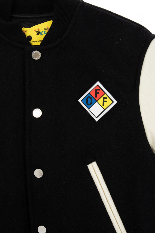 Black and white bomber jacket from Off-White Kids. Made of wool, this garment features snap fastenings, two slip pockets, multicolored logo appliqué, white logo embroidered at the back and ribbed trims at the collar, hem and cuffs.