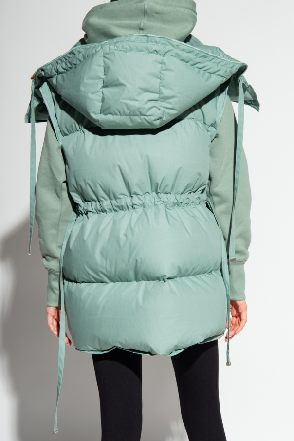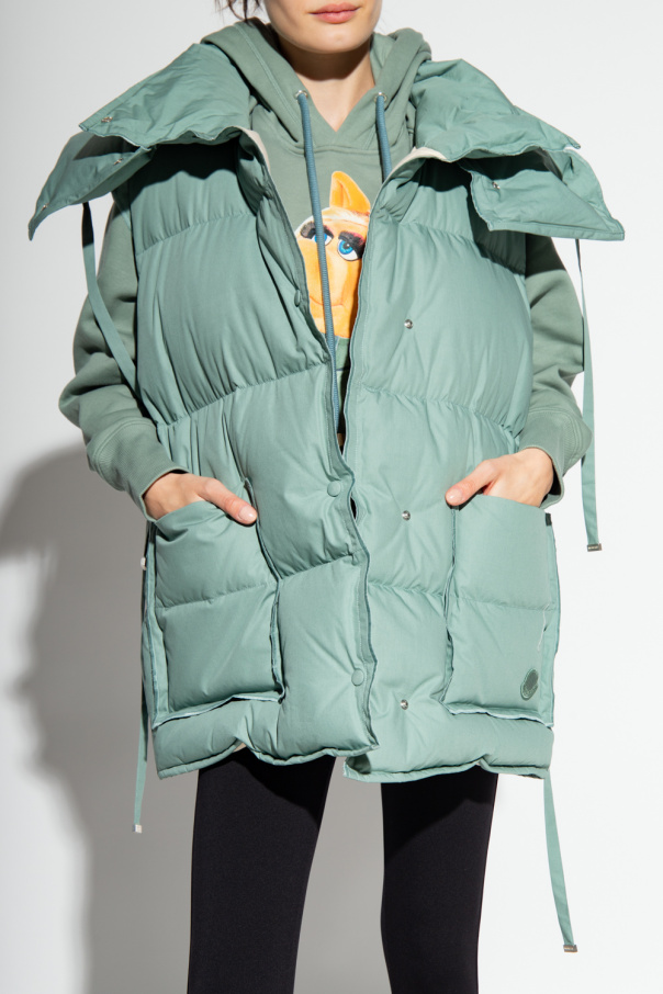 Light green ‘Batty’ quilted down vest from Moncler Genius, the ’2 Moncler 1952’ collection. Made of cotton canvas, this garment features snaps with a concealed placket, drawstring waist, detachable drawstring hood, logo patch and two front pockets.