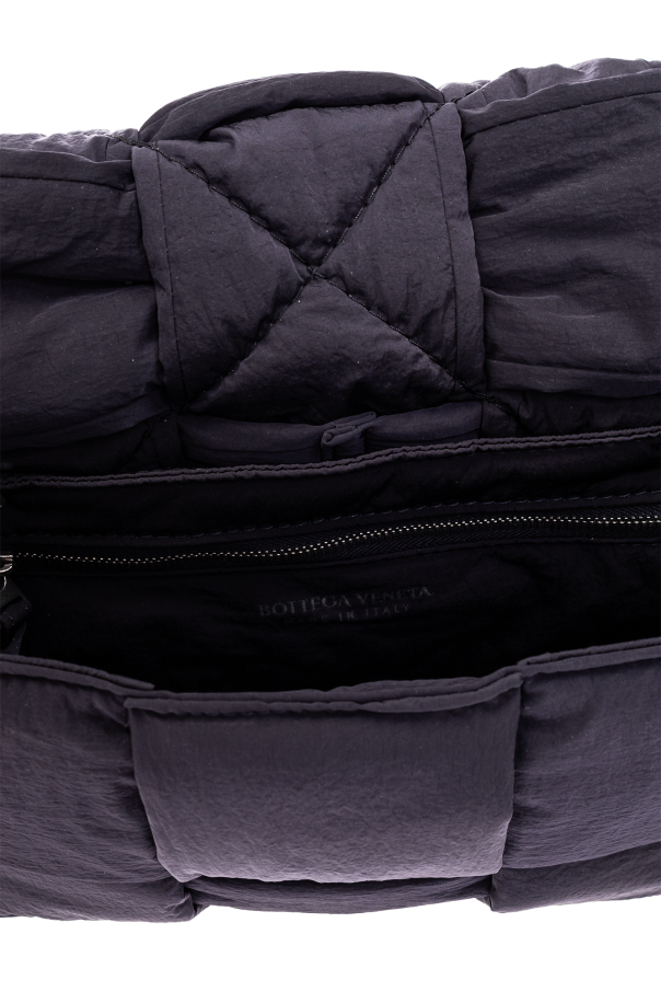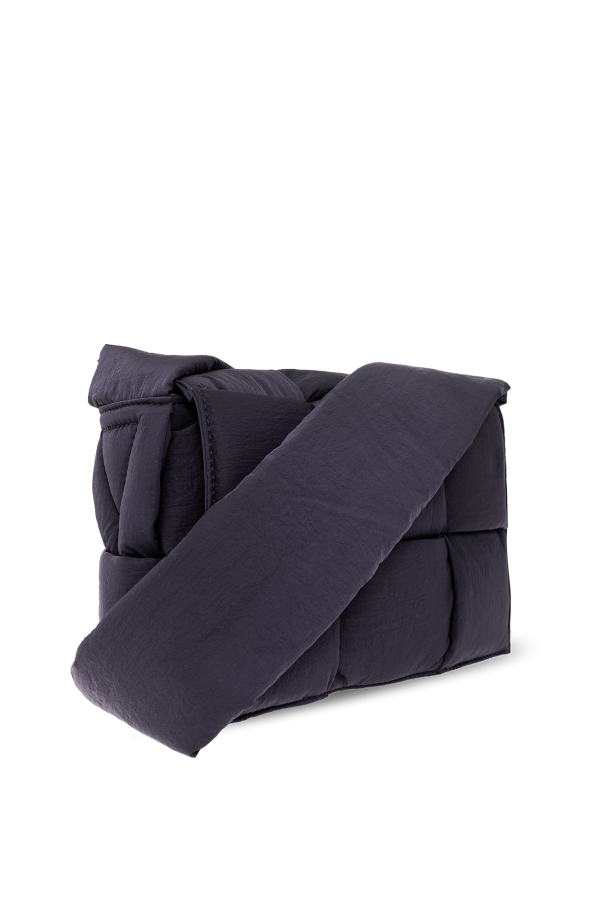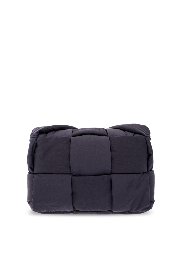 Navy blue ‘Cassette Small’ shoulder bag from Bottega Veneta. Made from fabric and accentuated with the brand\'s signature Intreccio weave, this design features an adjustable shoulder strap, silver-tone metal hardware and one internal compartment with a zip pocket.