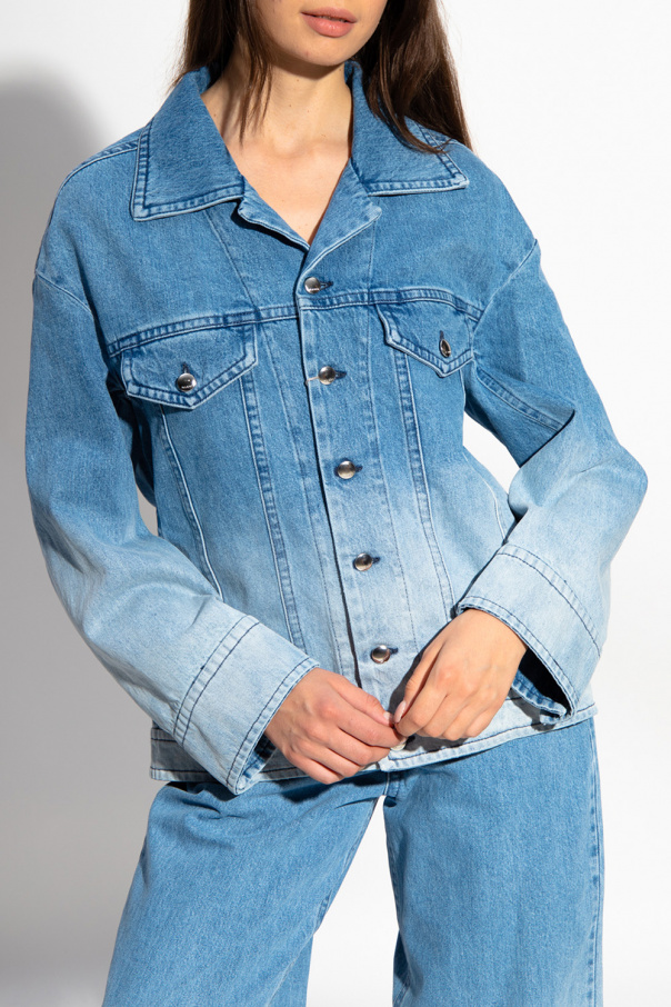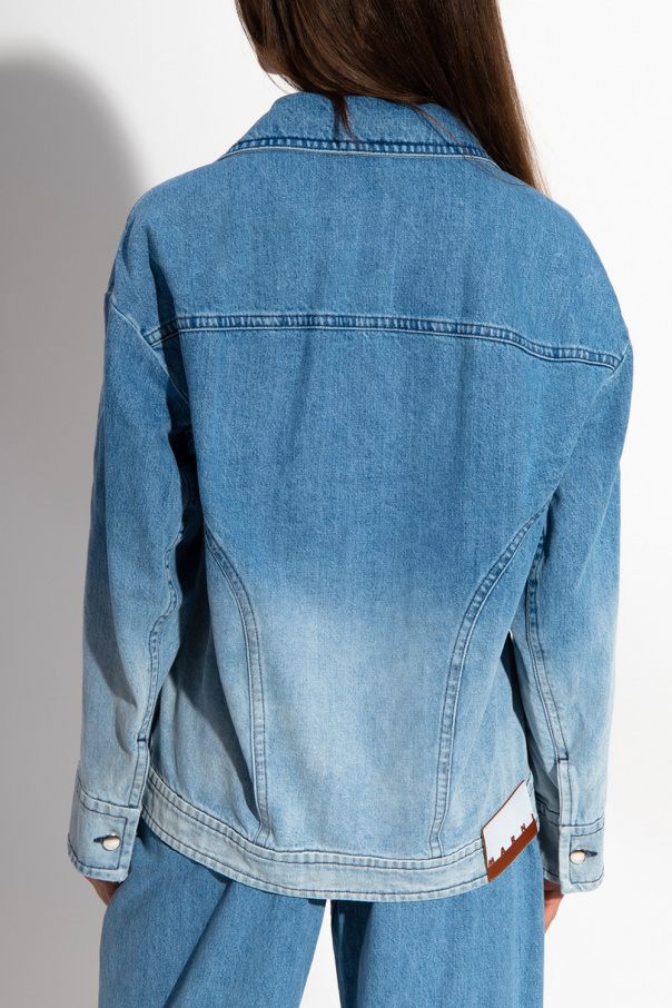 Blue denim jacket from Marni. Crafted from cotton, this garment features button fastenings, an ombre effect, two buttoned flap pockets, decorative stitching details, long sleeves with button cuffs and a logo patch in white and brown at the back.