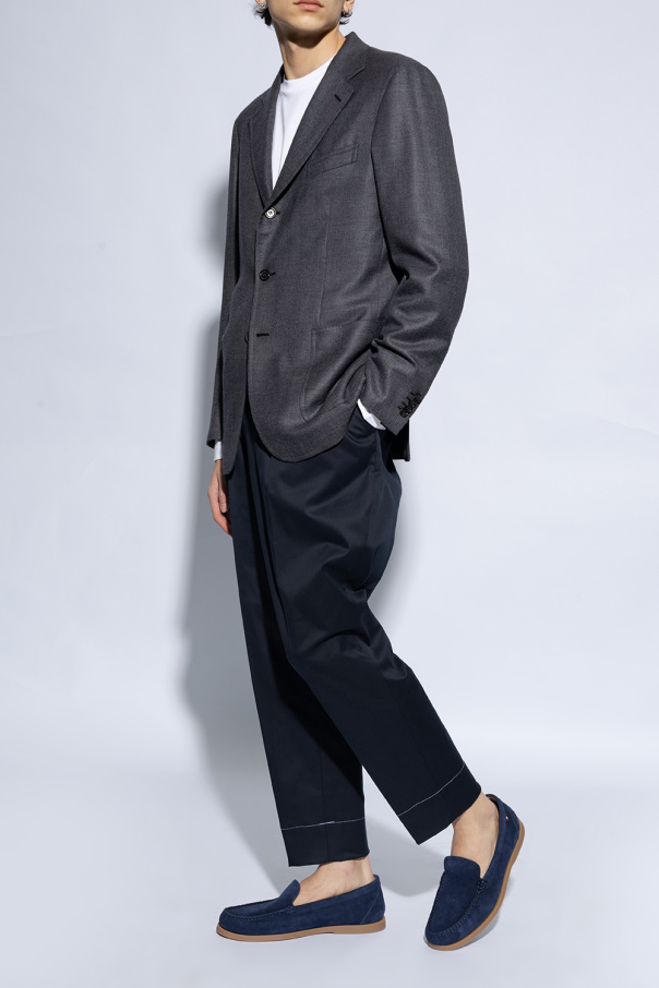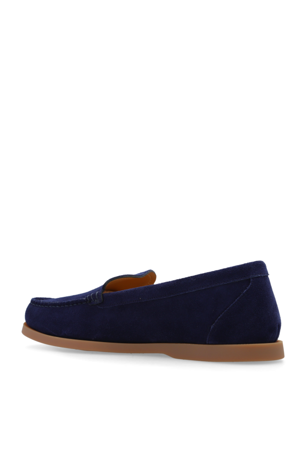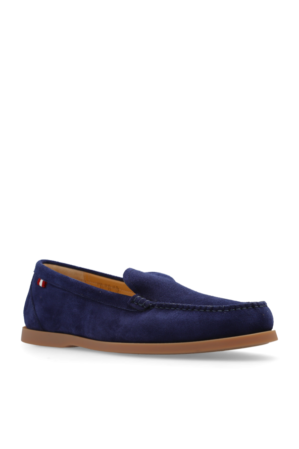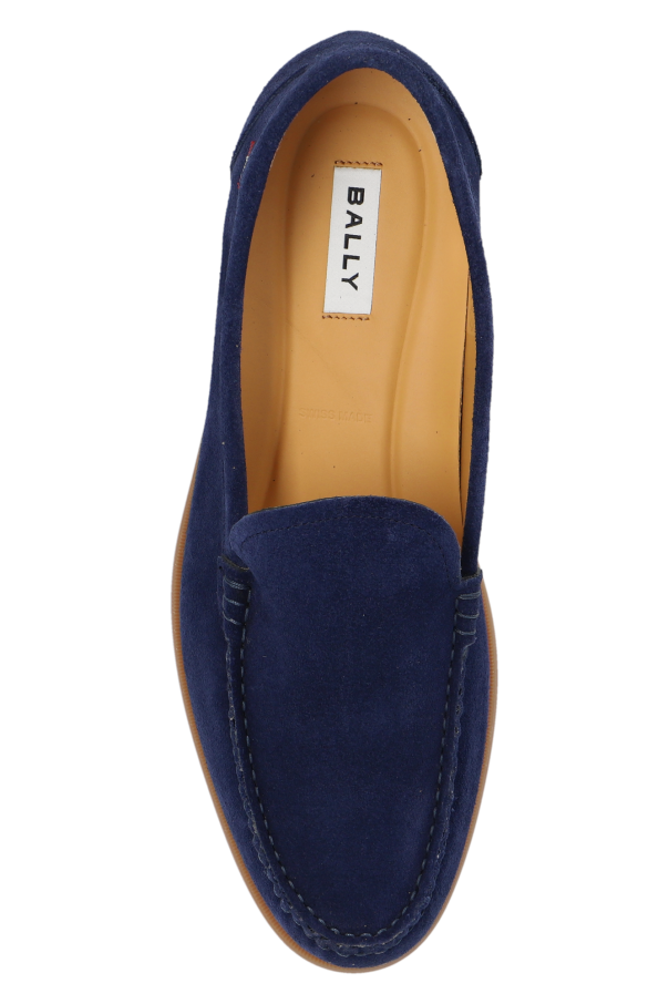 Navy blue moccasins from Bally. Made of suede, this model sits on a brown rubber sole and showcases a logo label sewn on the side and exposed stitching details on the front.