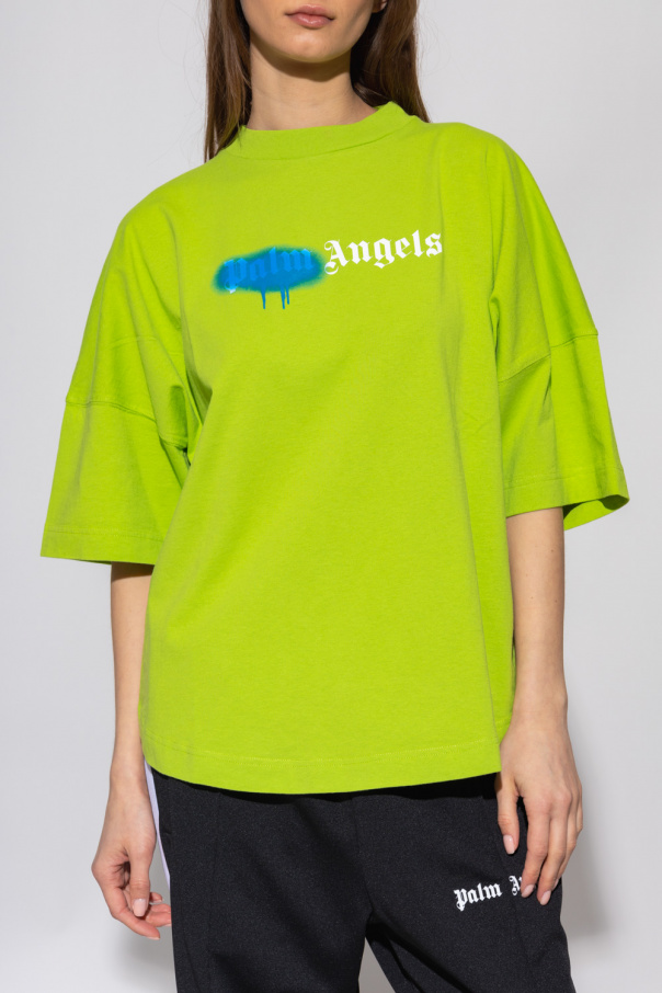 Green crewneck T-shirt from Palm Angels. Made of cotton with an oversize fit, this style features short sleeves, an elasticated collar and a white logo print accompanied by a blue spray paint effect across the front.