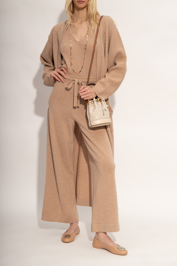 Beige ‘Claire’ ballet flats from Tory Burch. Crafted from leather, this model sits on a beige rubber sole and features a round toe, a back elastic trim and silver-tone and gold-tone logo hardware on the front.