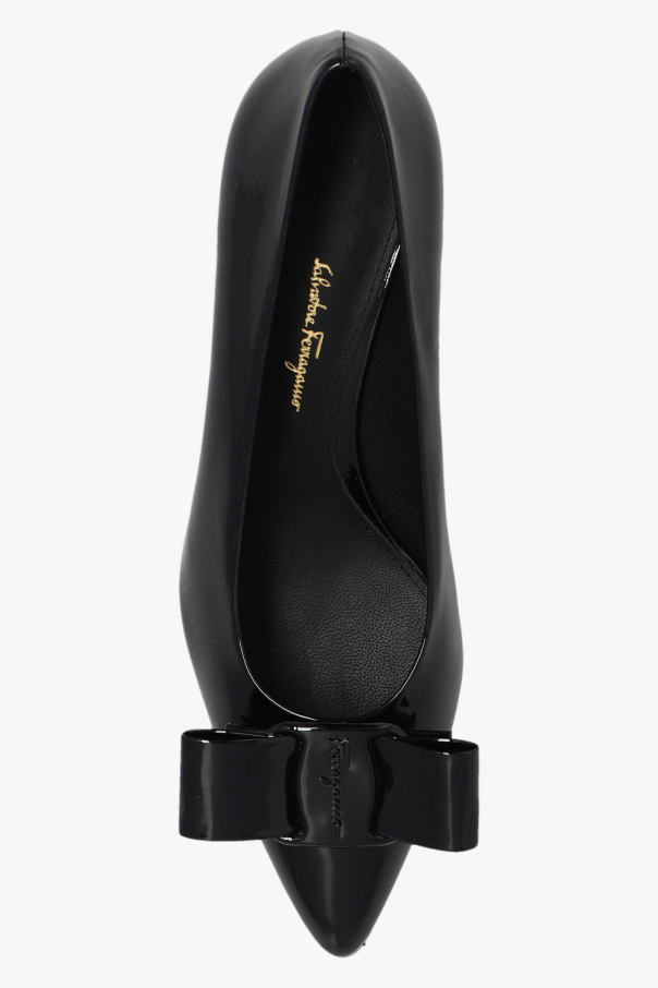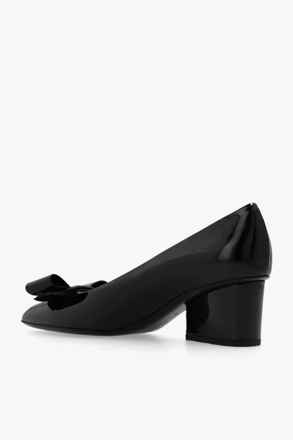 Black ‘Viva’ pumps from Salvatore Ferragamo. Made of patent leather, this model features a tapered toe, a black leather ole and a bow with a metal logo plaque on the front.