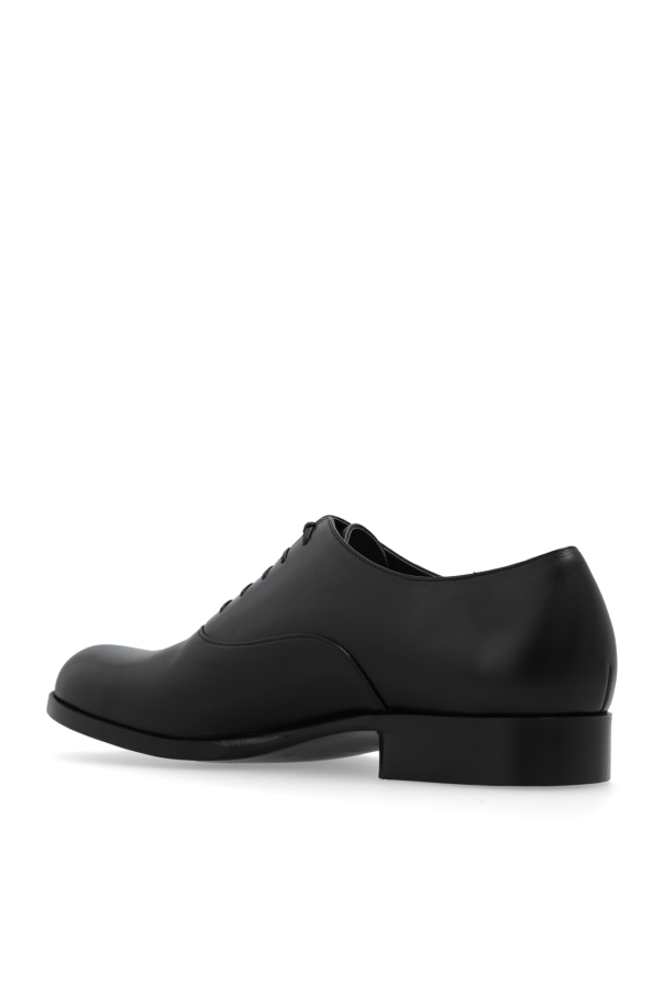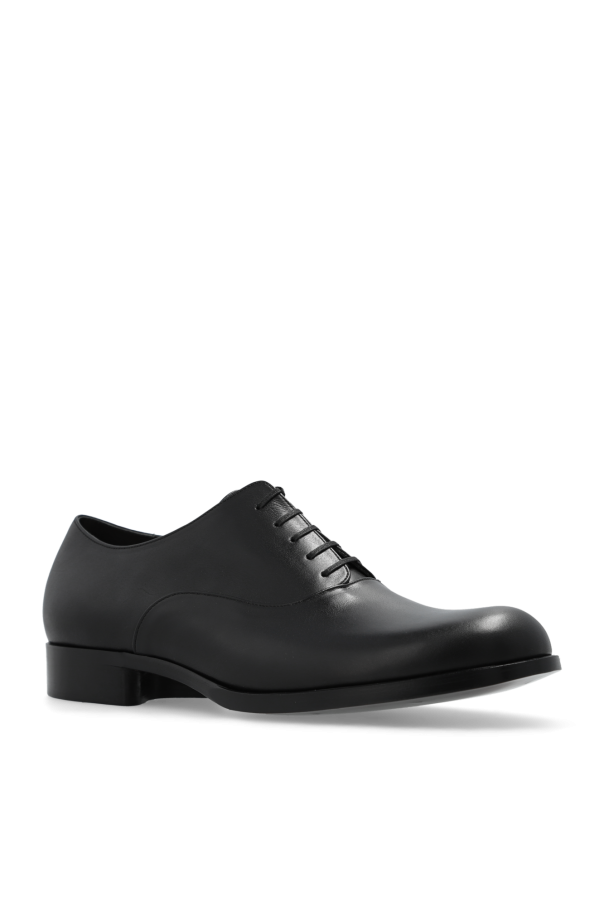 Black Oxford shoes from Petrosolaum. Crafted from oiled leather characterized by its subtle texture and transparency due to semi-aniline finish, this lace-up model sits on a brown leather sole. Manufactured using the McKay method, in which the insole, the instep leather, and the outsole are sewn all at once after being put into a wooden pattern. The copies may differ slightly from each other and have naturally occurring roughness and minor flaws.