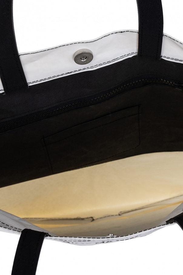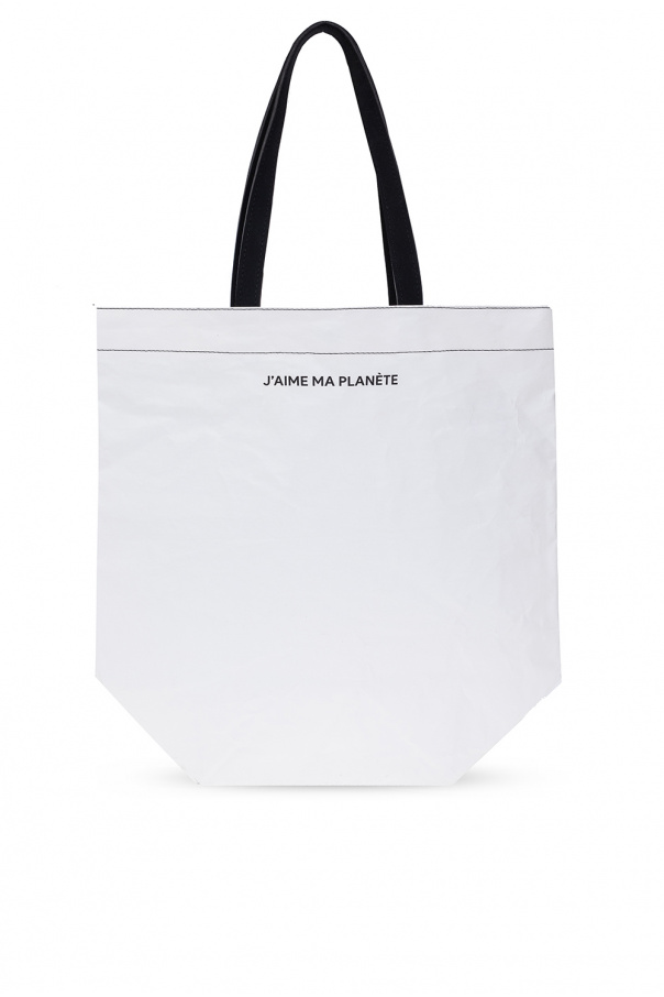 White shopper bag from Philippe Model. Made of cellulose fiber, this model features a snap closure, silver-tone logo print, black lettering at the back, two half-round straps and one internal compartment with one zip pocket and one slip pocket.