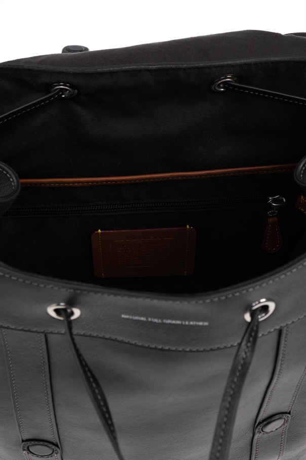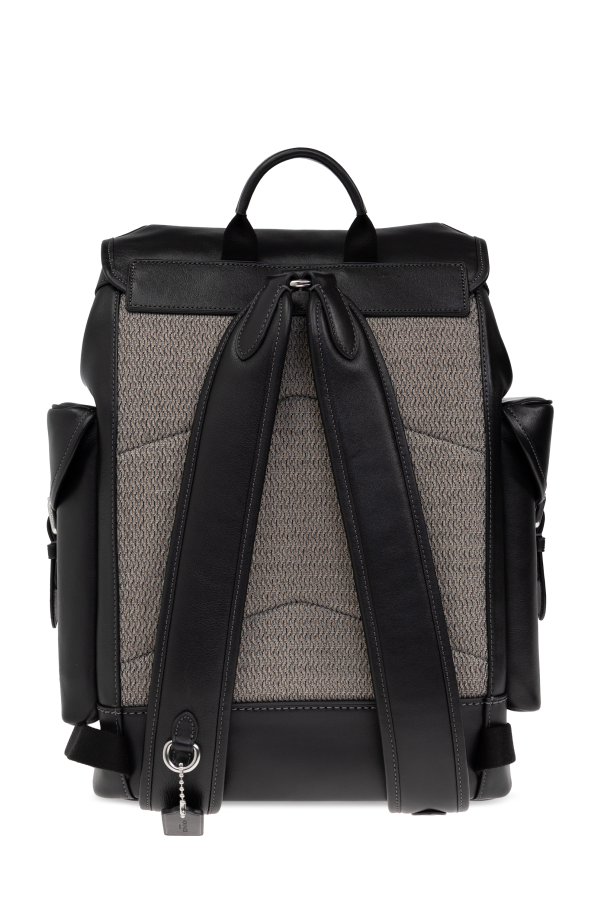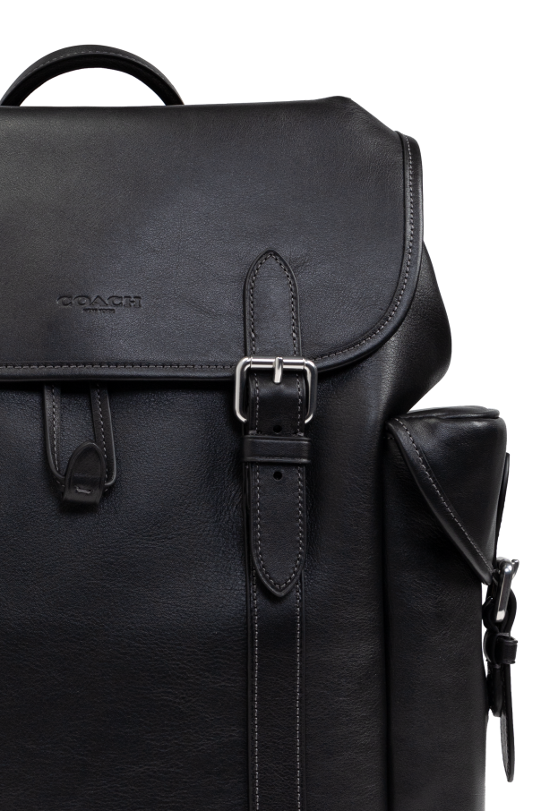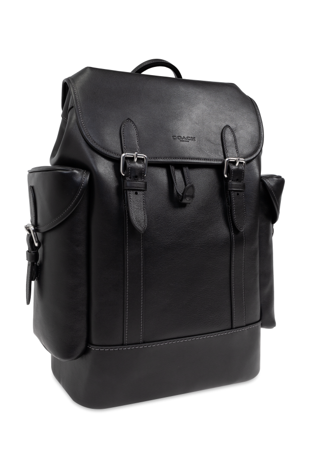 Introducing the Hitch Leather Backpack by the esteemed Coach, a paragon of luxury and elegance. Crafted from premium black leather, this backpack epitomizes sophistication with its sleek and opulent design. The front of the backpack features a flap secured by dual straps with metallic buckles, while side zippered pockets enhance its utility. The rear, adorned in a contrasting hue, boasts adjustable shoulder straps for comfort. Subtle brand insignia graces the front, reinforcing its exclusivity. Inside, a spacious compartment and three slip pockets ensure meticulous organization. The backpack\'s silver-toned zippers and hardware add a contemporary flair, making it perfect for everyday use or brief escapades. With meticulous craftsmanship and attention to detail, it embodies the quintessential quality of a luxury brand. Why Choose This Product? Premium black leather construction Elegant design with functional side pockets Spacious interior with organizational features Subtle logo for a touch of exclusivity Adjustable shoulder straps for comfort
