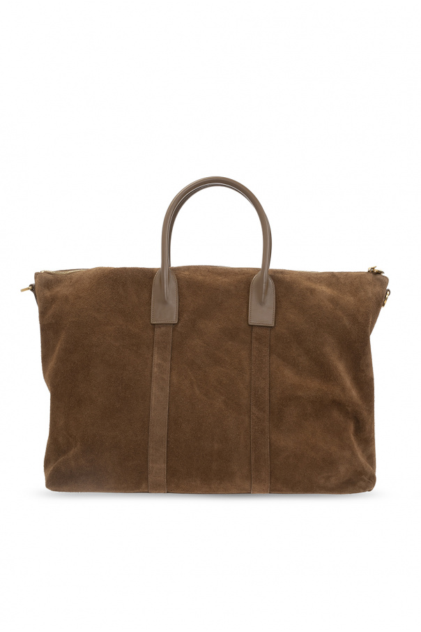 Brown ‘Giant’ holdall bag from Saint Laurent. Crafted from suede, this model fastens with a zip and is complete with two half-round handles with a charm, detachable and adjustable straps with a chain, gold-tone metal hardware and one internal compartment with one zip pocket.