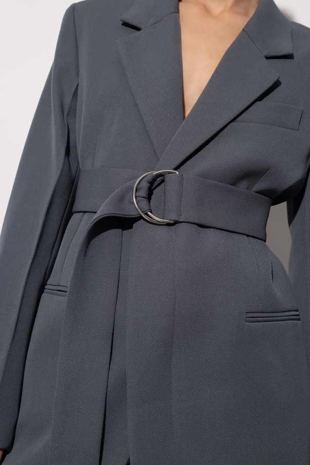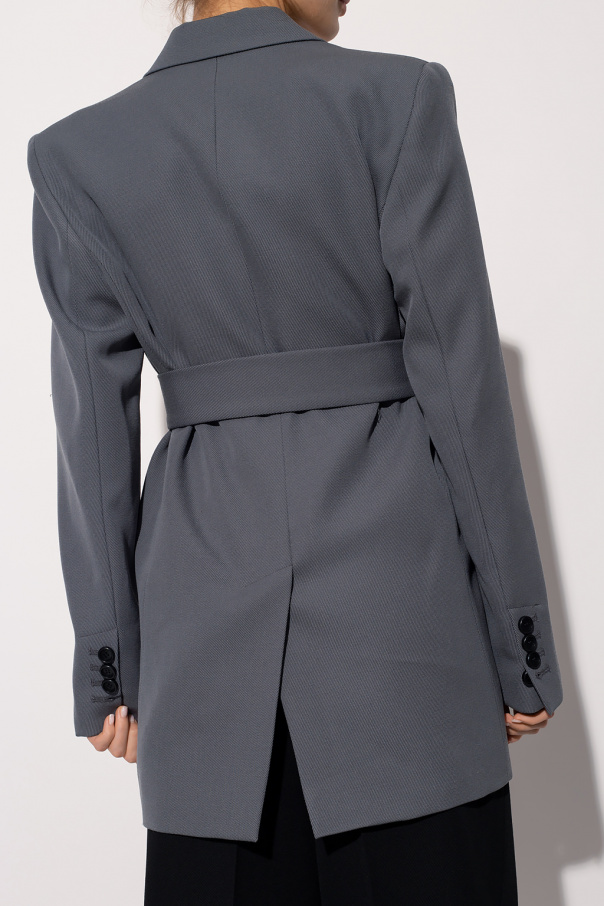 Grey blazer from Ami Alexandre Mattiussi. Crafted from wool, this style features button fastenings, notch lapels, padded shoulders, long sleeves, three slip pockets on the front and a single back vent. It comes with a belt with a silver-tone metal buckle.