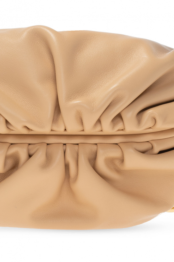 Beige belt bag from Bottega Veneta. Size medium. Crafted from calf leather with ruched details, this design fastens via a magnetic snap and features a chain strap, gold-tone metal hardware and one internal compartment.