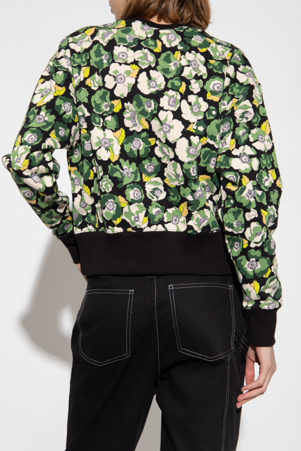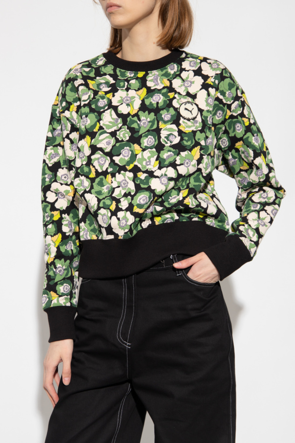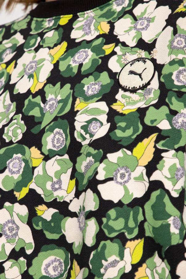 Black crewneck sweatshirt from Puma x Liberty. Crafted from cotton, this long sleeve design is enriched by a multicolored floral motif, logo patch and ribbed trims at the neck, hem and cuffs. Drawing inspiration from the unique beauty and unconstrained nature of wild flowers, the collection is designed to empower the powerful and fearless women who boldly embrace their wild.