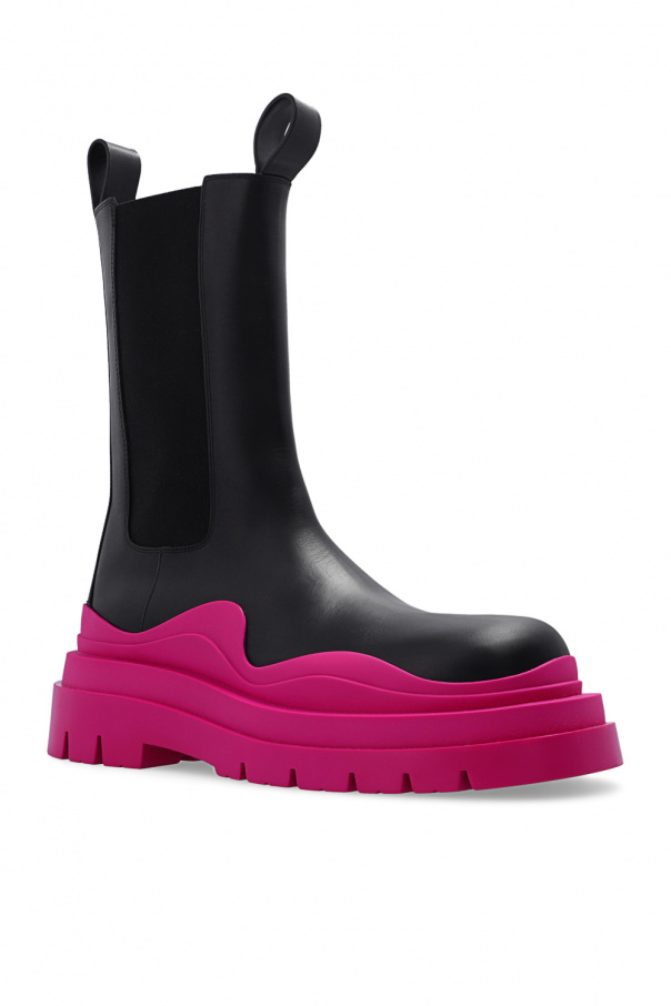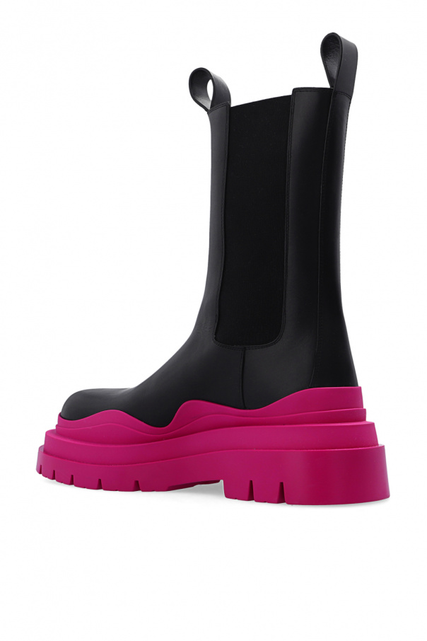 Black ‘Tire’ slip-on ankle boots from Bottega Veneta. Made of leather, this pair features elastic side panels and dark pink rubber sole.
