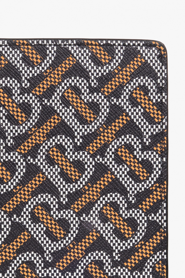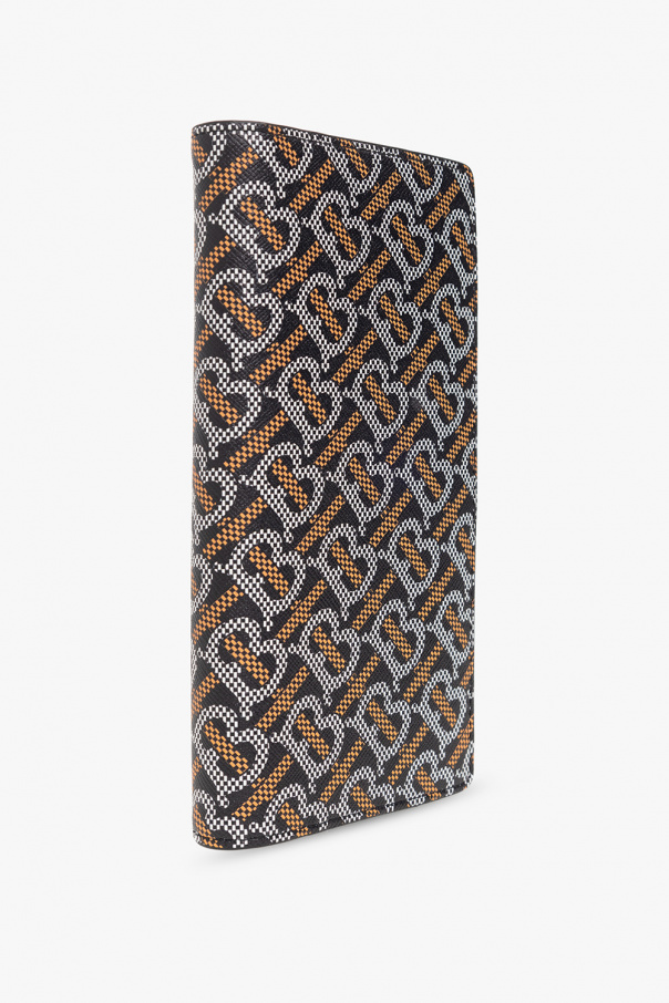 Black bi-fold wallet from Burberry. Crafted from canvas, this item features a white and orange monogram pattern and a calf leather-clad interior with a bill compartment, one zip coin pocket, three slip pockets and 16 card slots.