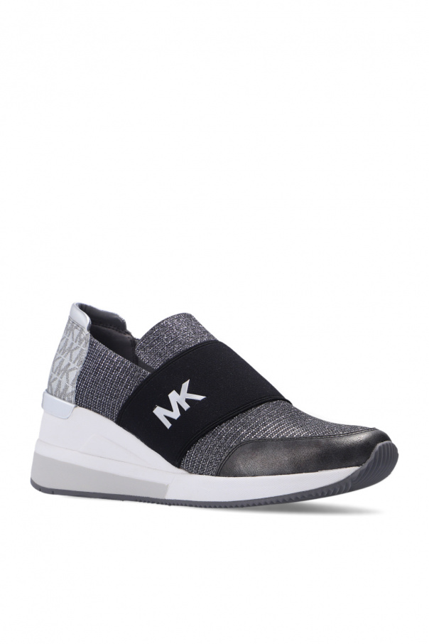 White, black and silver-tone ‘Felix’ sneakers from Michael Michael Kors. Set on a grey rubber sole, this pair is enriched by a logo detail and glitter.