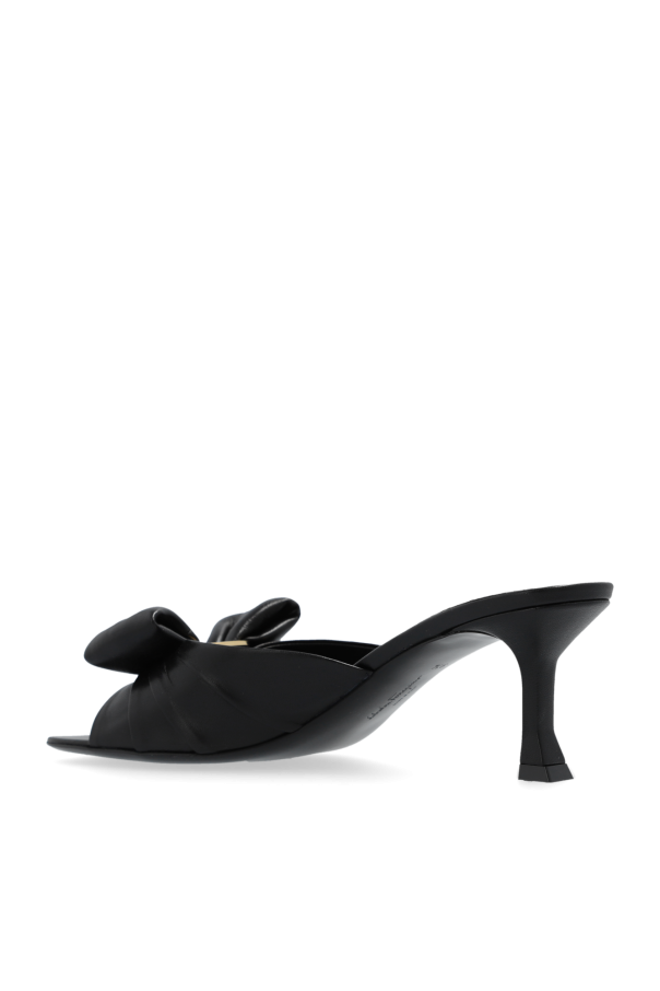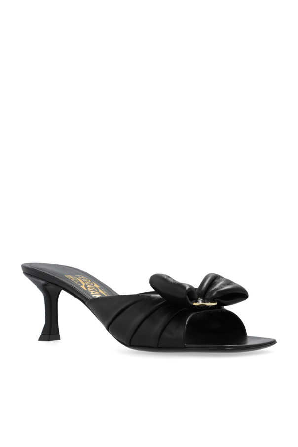 Introducing the pinnacle of sophisticated footwear - the \'Lucie\' Heeled Mules by the illustrious FERRAGAMO. Crafted from the finest lamb leather, these mules exude luxury with their smooth texture and sleek black hue. The open front design gracefully reveals the toes, while the volumetric knot adorning the front adds a unique, eye-catching detail. Standing on a conical heel of moderate height, these mules offer both stability and comfort, making them perfect for any elegant ensemble. The meticulous craftsmanship of FERRAGAMO is apparent in every aspect of these mules, from the gold inscription and logo on the insole, signifying the brand\'s exclusivity, to the thoughtful design that marries style with practicality. Whether showcased on their own or worn by a model paired with a white midi skirt, black top, and a green belt, the \'Lucie\' Heeled Mules are versatile, enhancing any outfit with chic sophistication. Why Purchase the \'Lucie\' Heeled Mules? Exceptional quality, crafted from 100% lamb leather. Elegant design with a unique volumetric knot for a distinctive look. Moderate heel height ensures both style and comfort. Iconic FERRAGAMO branding adds an element of luxury. Versatile, elevating both casual and formal outfits with ease.